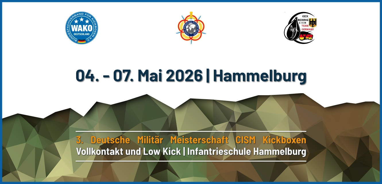 Im Mai 2026 trifft sich die militärische Kickbox-Elite wieder in Hammelburg: Vom 04. bis 07. Mai findet die 3. Deutsche Militärmeisterschaft CISM Kickboxen statt. In den Disziplinen Vollkontakt und Low Kick zeigen Soldatinnen und Soldaten aus ganz Deutschland ihr Können im Ring.