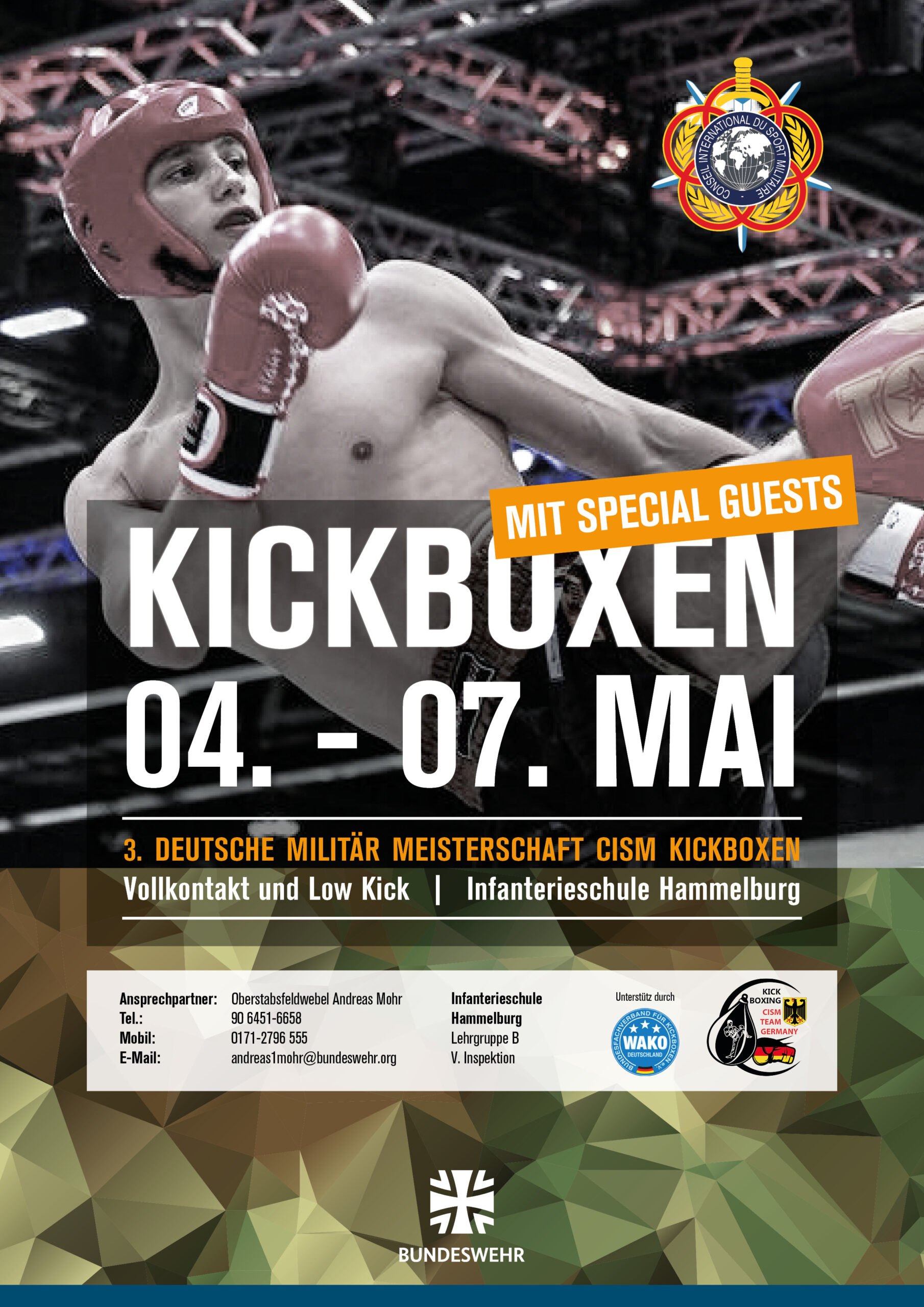 Im Mai 2026 trifft sich die militärische Kickbox-Elite wieder in Hammelburg: Vom 04. bis 07. Mai findet die 3. Deutsche Militärmeisterschaft CISM Kickboxen statt. In den Disziplinen Vollkontakt und Low Kick zeigen Soldatinnen und Soldaten aus ganz Deutschland ihr Können im Ring.